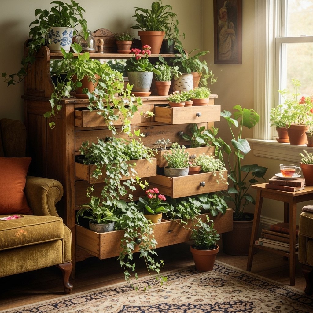 Repurposing old furniture into plant displays is a creative and eco-friendly DIY idea. Items like old stools, drawers, or cabinets can be transformed into unique plant stands. This adds character and a vintage feel to your living room. You can mix and match plant sizes to create an eye-catching arrangement. It’s a great way to recycle while enhancing your home decor.