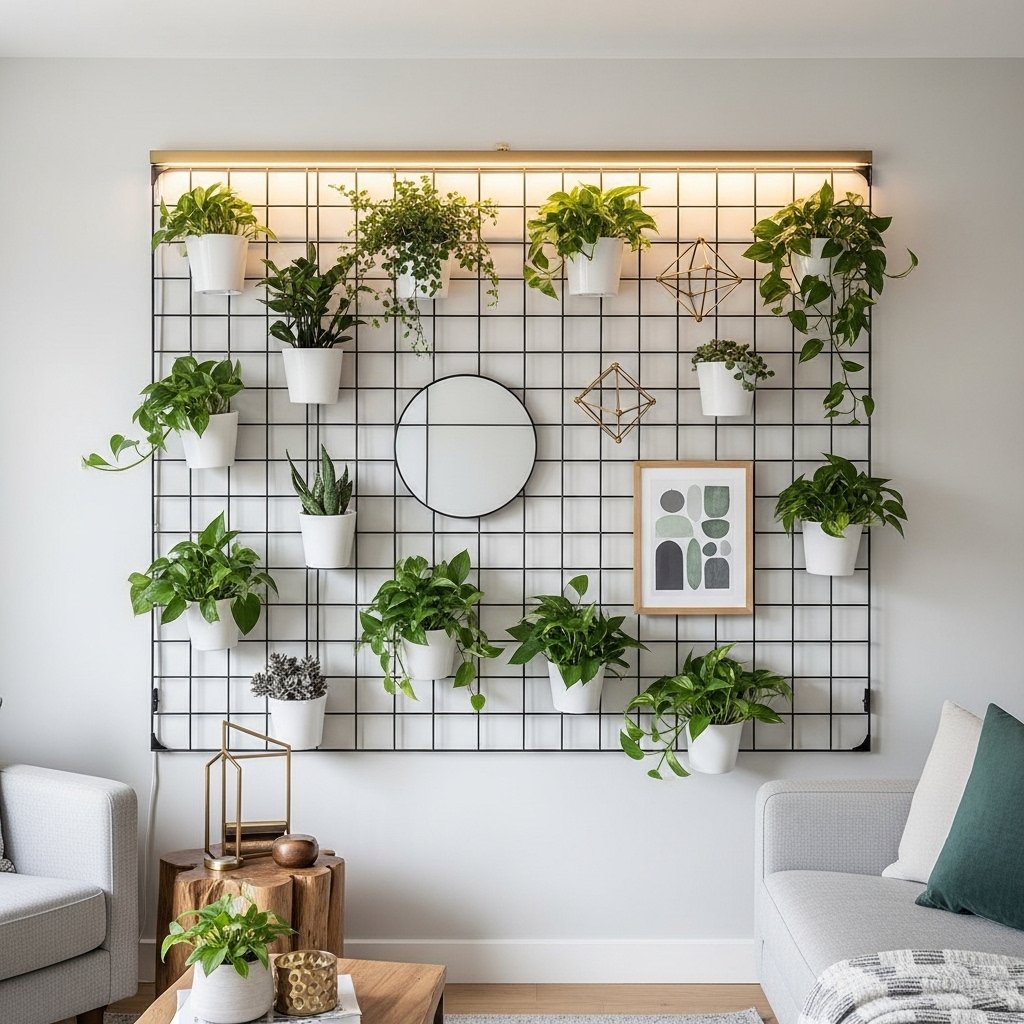 A wall-mounted plant grid is a modern and versatile way to decorate with indoor plants. Using a metal grid panel, you can hang small pots, baskets, or decorative elements. This setup allows flexibility as you can rearrange plants anytime. It works well for creating a feature wall in your living room. This idea blends greenery with contemporary design effortlessly.