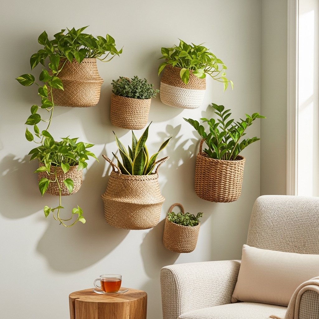 Plant baskets add warmth and texture to your living room decor while keeping things natural. You can use woven baskets or create your own using simple materials. Placing plants inside baskets hides plastic pots and enhances the overall look. This idea works well for larger plants like snake plants or palms. It’s an easy way to make your living room feel cozy and inviting.