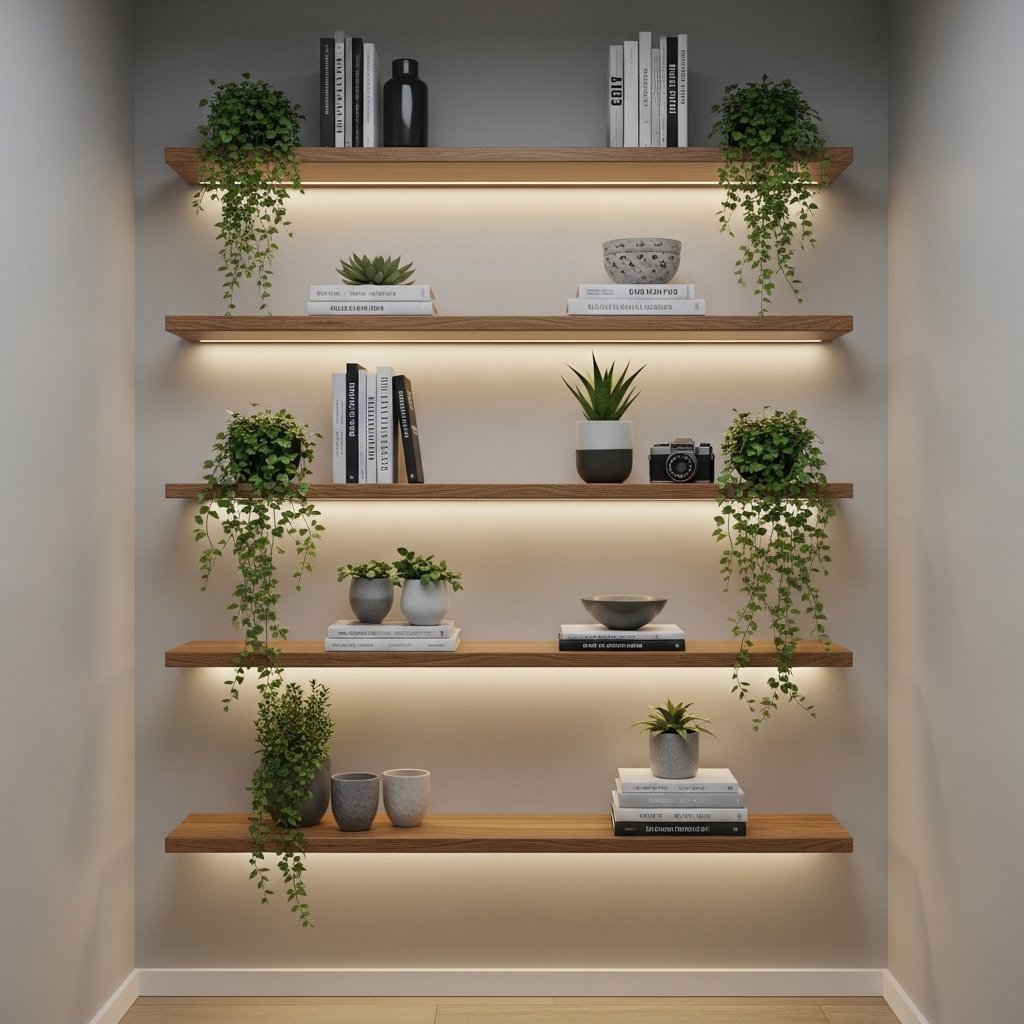 Floating shelves are perfect for displaying indoor plants in a structured way. You can place small pots on different shelf levels to create a layered green wall effect. This works especially well in narrow rooms or hallways. Mixing plants with books or decorative items enhances the aesthetic appeal. It is a smart solution for vertical decoration in tight spaces.
