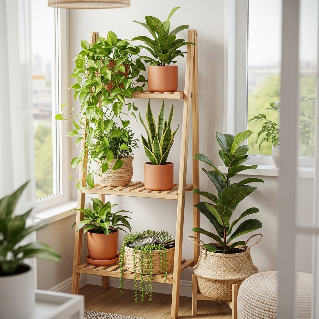 A ladder-style plant stand is a creative way to display multiple plants vertically. It allows you to organize plants on different levels without occupying too much floor space. This setup works well in living rooms or balconies. You can mix different plant sizes for a dynamic visual effect. It adds both structure and greenery to small interiors.