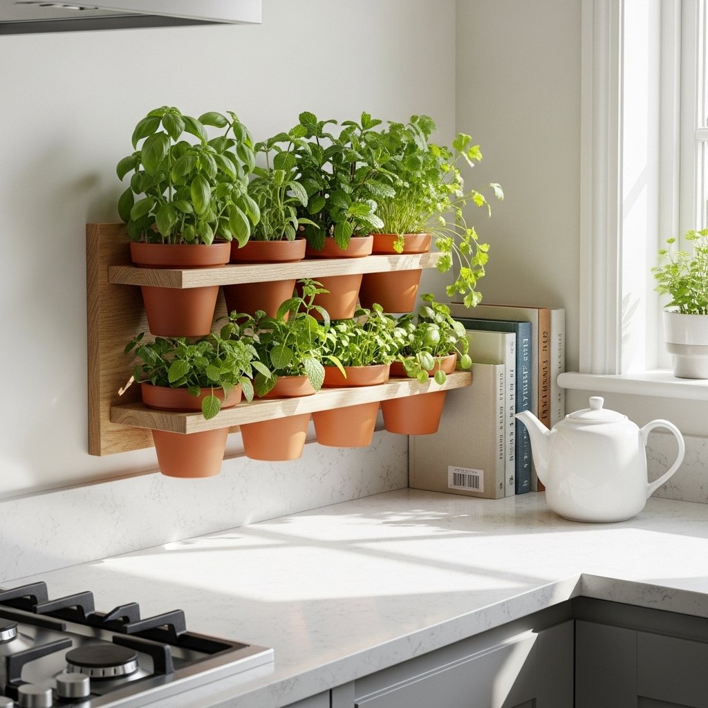 A kitchen herb rack is both decorative and functional for small homes. You can grow basil, mint, or coriander in compact pots placed on a wall-mounted rack. This keeps your cooking ingredients fresh and easily accessible. It also adds a natural green touch to your kitchen walls. This idea is perfect for people who love cooking and greenery together.