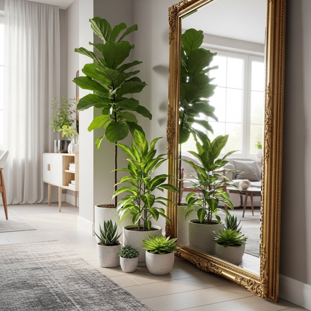 Placing plants near mirrors can make small spaces appear larger. The reflection doubles the greenery effect, creating an illusion of depth. This trick works especially well in narrow rooms or hallways. Choose medium-sized plants for a balanced visual impact. It’s a smart design hack for compact interiors.