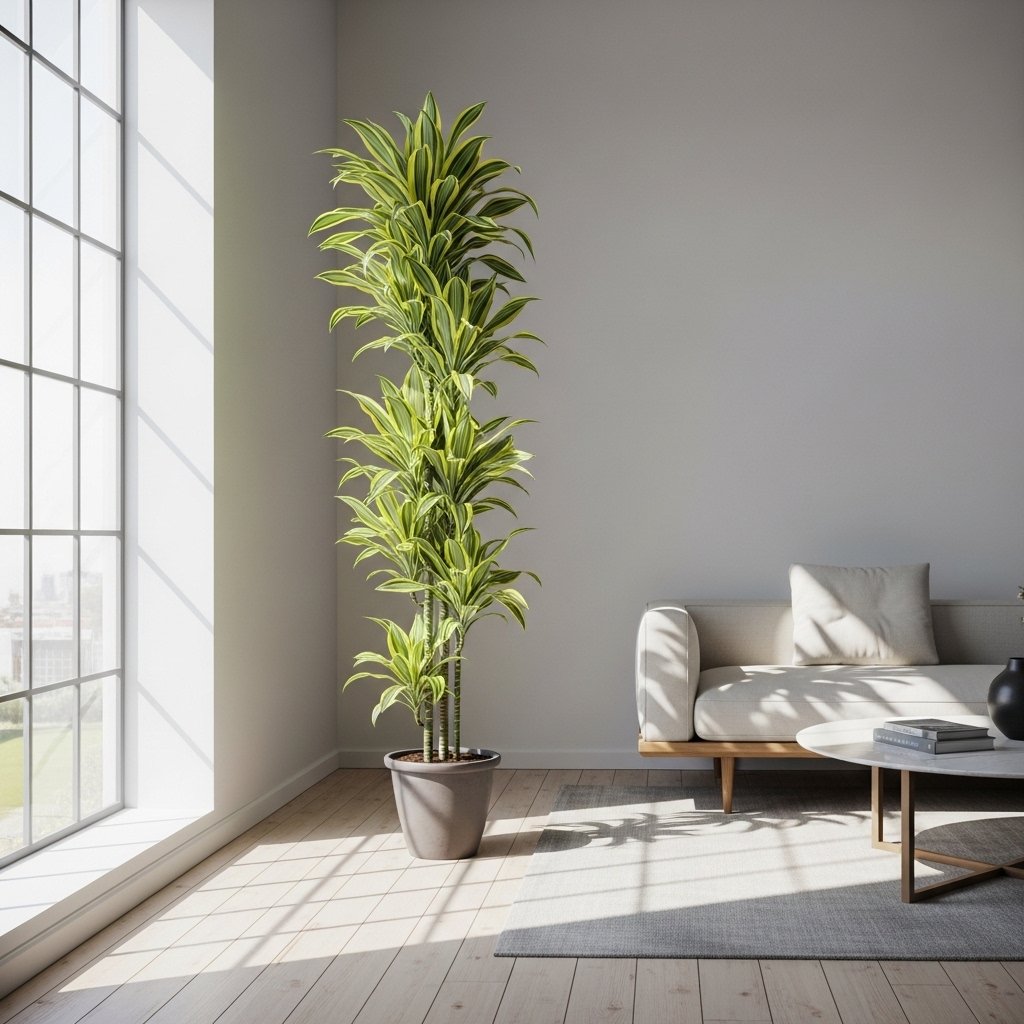 Dracaena plants are elegant, architectural greenery that fits well in contemporary living rooms. Their upright stems and variegated leaves create height and structure without overwhelming the room. Dracaenas tolerate low to bright indirect light and require minimal maintenance. Pairing them with modern pots enhances their sculptural quality. They are ideal for corners or as floor-standing features to create a chic, natural focal point.