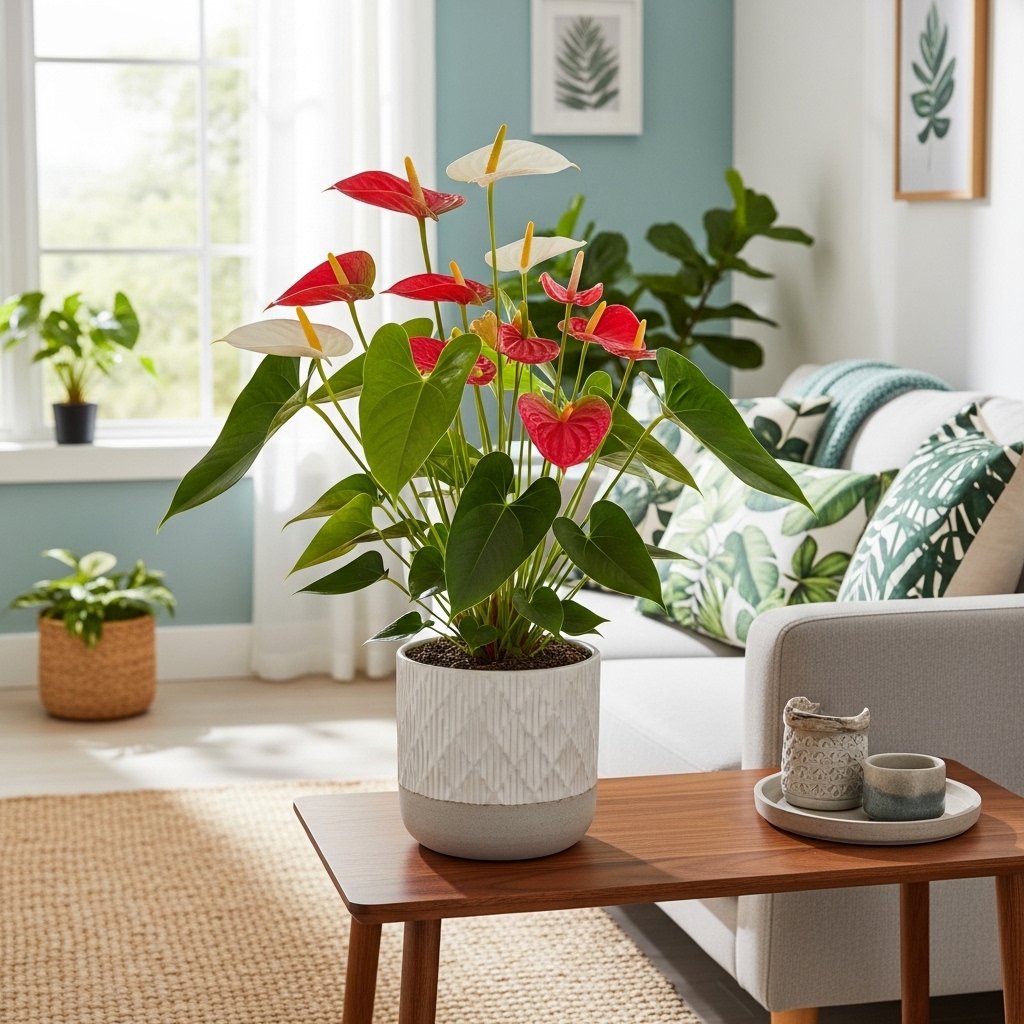 Anthurium plants are stunning for living room decor due to their glossy, heart-shaped leaves and vibrant flowers. Their red, pink, or white blooms create a pop of color against green foliage, adding energy and sophistication. They thrive in bright, indirect light and moderate humidity. Anthuriums work well on side tables, shelves, or plant stands, becoming conversation pieces in any living room. Incorporating this plant adds elegance, tropical charm, and a lively atmosphere to your space.