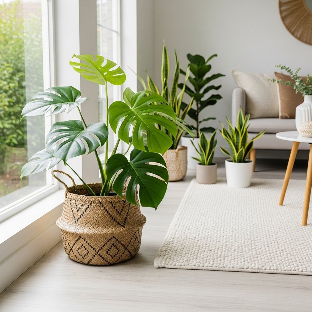 Monstera Deliciosa, also known as the Swiss Cheese Plant, is perfect for adding a tropical vibe to your living room. Its iconic split leaves create a bold, artistic statement, especially in corners or near windows. This plant thrives in medium to bright indirect light and can tolerate some humidity, making it low-maintenance. A Monstera can be styled in large ceramic pots or woven baskets to suit boho or eclectic decor themes. Its presence instantly brightens up the space while giving a natural, lush feel.