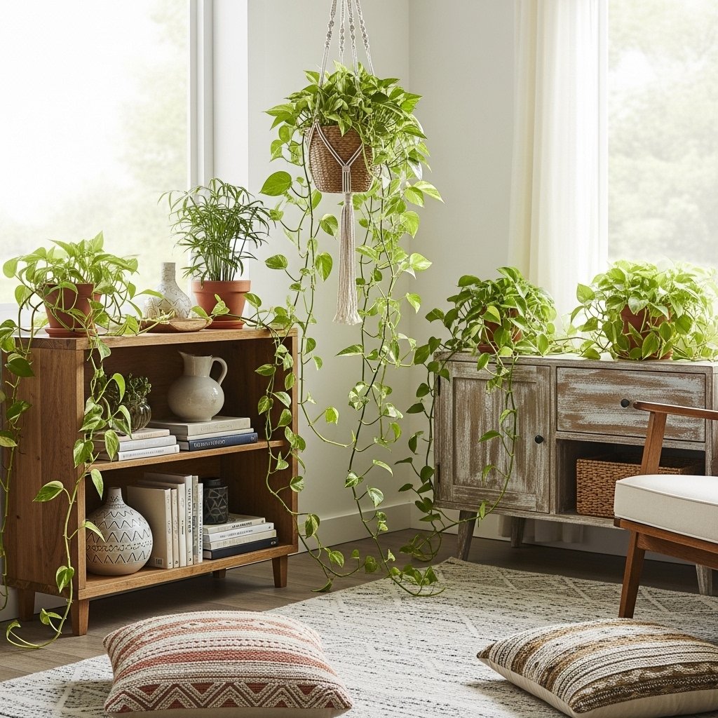 Pothos is a versatile trailing plant that works wonderfully in living room decor, whether on shelves, hanging baskets, or bookcases. Its cascading vines bring movement and greenery into the room effortlessly. Pothos tolerates low to bright indirect light and is incredibly easy to care for, making it perfect for beginners. You can train it to climb trellises or let it flow naturally for a relaxed aesthetic. This plant is ideal for adding a lush, jungle-like touch without consuming much space.