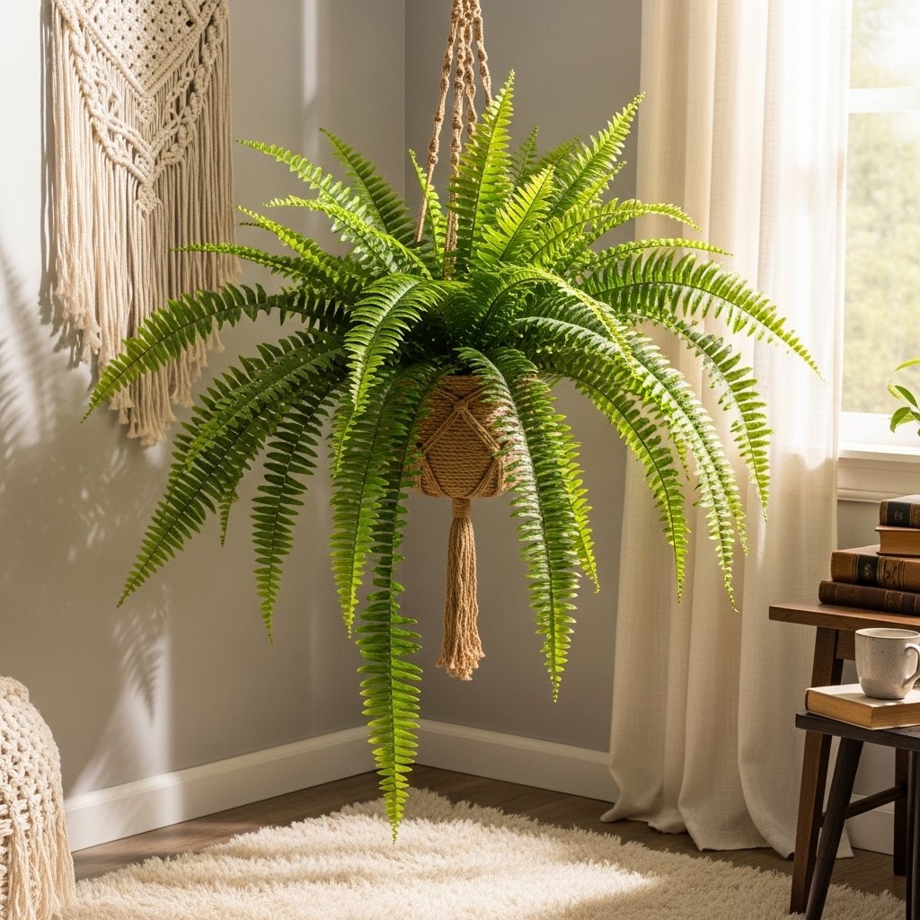 Boston Ferns are classic houseplants that add softness and texture to living rooms. Their feathery, lush foliage works beautifully in hanging baskets or elevated planters. They prefer indirect light and consistent moisture, making them ideal for rooms with moderate humidity. Boston Ferns complement traditional, bohemian, and cottage-style interiors effortlessly. Their cascading fronds bring a lively, natural feel, transforming any dull corner into a vibrant green space.