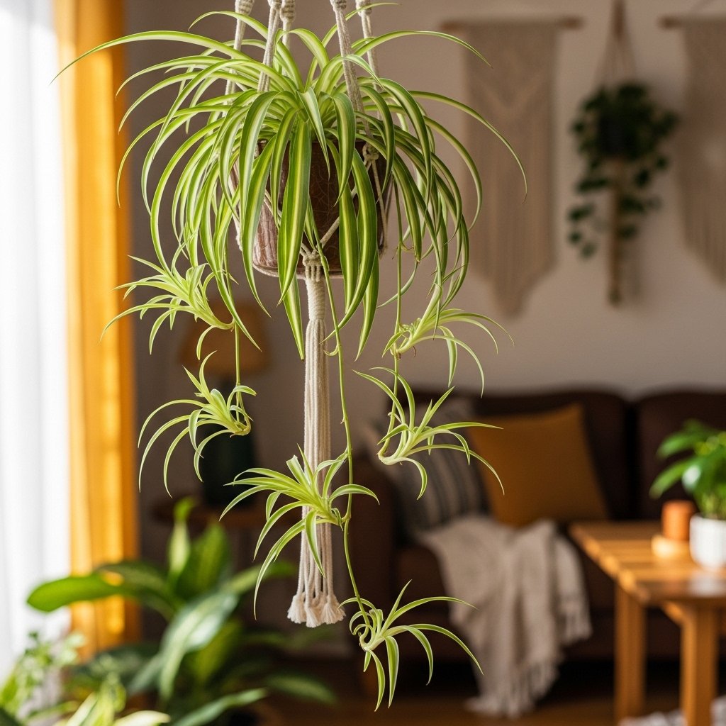 Spider plants are charming, hardy options that are perfect for hanging baskets or tabletop displays. Their variegated leaves with green and white stripes add visual interest and a lively touch to any space. Spider plants thrive in moderate indirect light and need occasional watering, making them very easy to maintain. They also produce offshoots that can be propagated into new plants, perfect for growing your indoor garden. Hanging them near windows allows their leaves to cascade naturally, creating a soft, flowing effect.