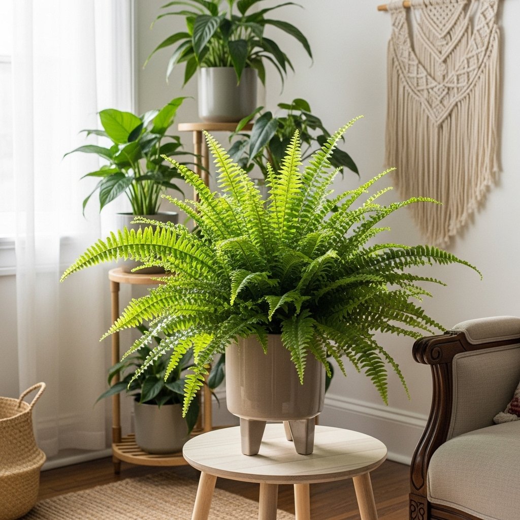 Boston ferns are classic, lush plants that bring a tropical, vibrant touch to living rooms. Their feathery fronds add texture and fullness, making them ideal for corner displays or elevated plant stands. Boston ferns thrive in indirect light and require consistent moisture, making them a slightly higher-maintenance but highly rewarding choice. They are excellent for humid environments and can brighten up modern, bohemian, or traditional interiors. Grouping them with other green plants creates a rich, layered aesthetic.