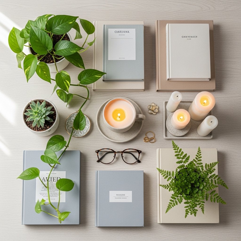 Flat lay indoor plant pictures are taken from a top-down perspective for creative styling. You can arrange plants with books, candles, or decor items on a flat surface. This composition is often used for social media and Pinterest content. Soft natural lighting helps create a clean and balanced image. It is perfect for showcasing plant styling creativity.