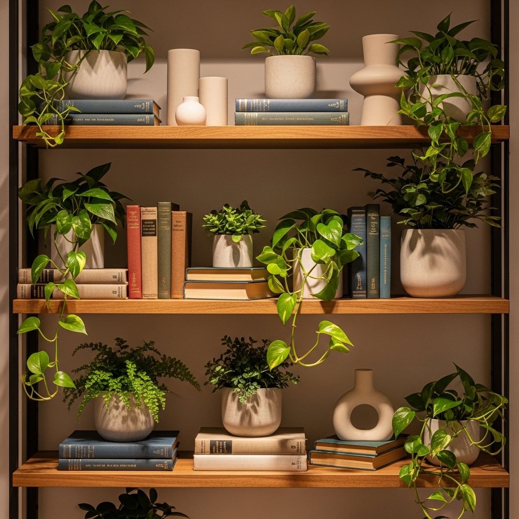 Aesthetic indoor plants pictures featuring shelves are highly popular in modern decor trends. These images show plants arranged neatly on wooden or floating shelves alongside books and decor items. Small pots, succulents, and decorative planters create a balanced visual composition. The mix of greenery and personal items adds character to the space. These pictures are perfect inspiration for styling shelves in bedrooms or living rooms.
