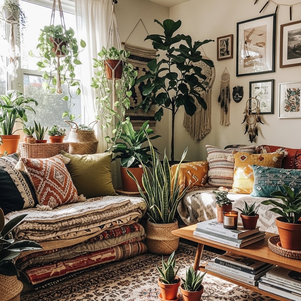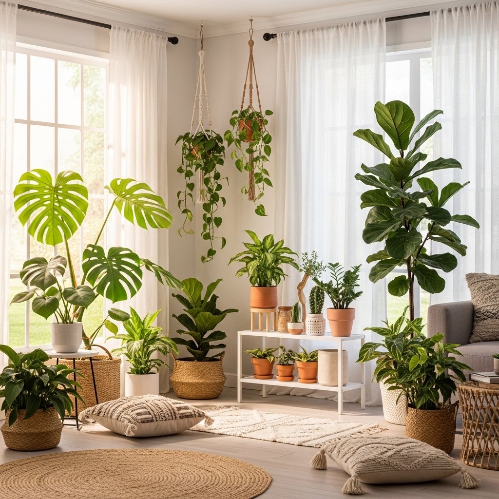 Boho indoor plants pictures combine greenery with artistic and relaxed decor elements. These visuals often include woven baskets, patterned rugs, and layered textiles. Plants are arranged in a casual yet visually appealing manner, creating a cozy and lived-in feel. Warm tones and natural materials enhance the bohemian vibe. These pictures are perfect for those who love creative and free-spirited home design.