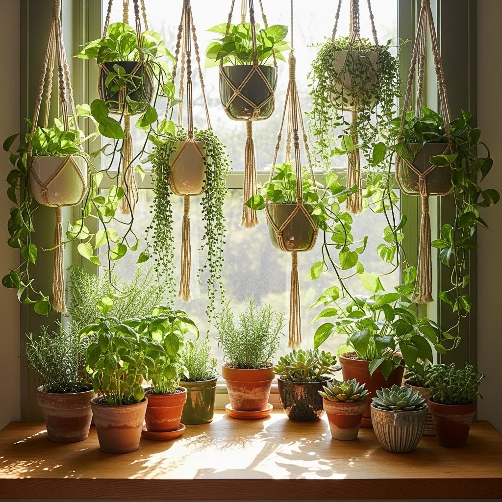 If your windowsill space is limited, consider adding hanging planters just above it. This creates a layered greenery effect without overcrowding the sill itself. Choose lightweight pots and secure them properly for safety. Hanging plants add vertical interest and make the window area more eye-catching. This idea works well in smaller rooms or apartments.