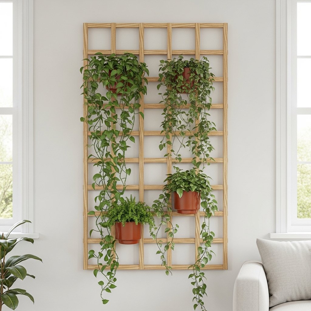 A wooden grid wall trellis is a classic and versatile option for indoor plants. It provides a sturdy structure for climbing plants while adding a warm, natural touch to your interior. You can choose light or dark wood depending on your decor style. This type of trellis works especially well in living rooms or near windows where plants get enough light. Over time, the plants will weave through the grid, creating a lush green wall effect.