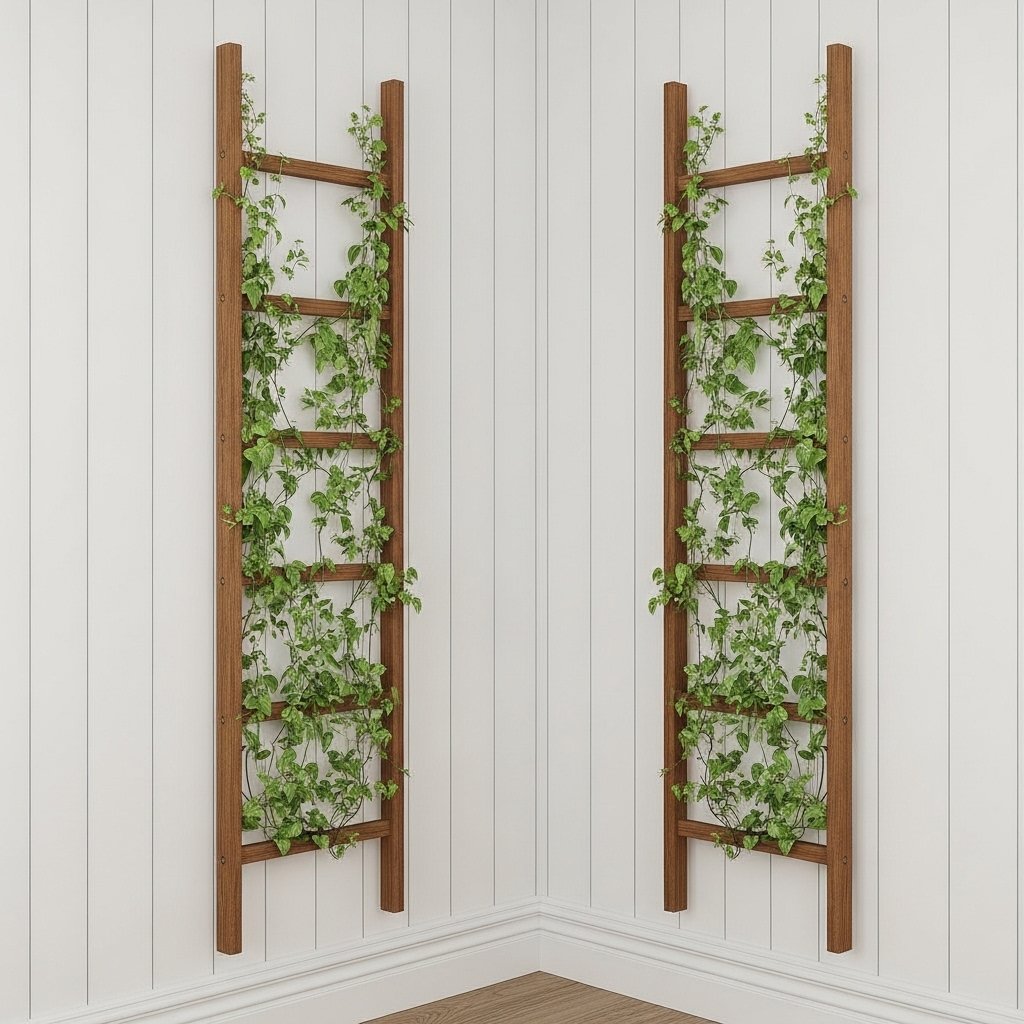 A ladder-style trellis offers both support and visual appeal for climbing plants. It can be mounted on the wall or leaned against it for a casual look. Each rung provides a perfect place for vines to wrap around and grow upward. This style works beautifully in corners or narrow spaces. It creates a structured yet relaxed vibe that complements various decor styles.