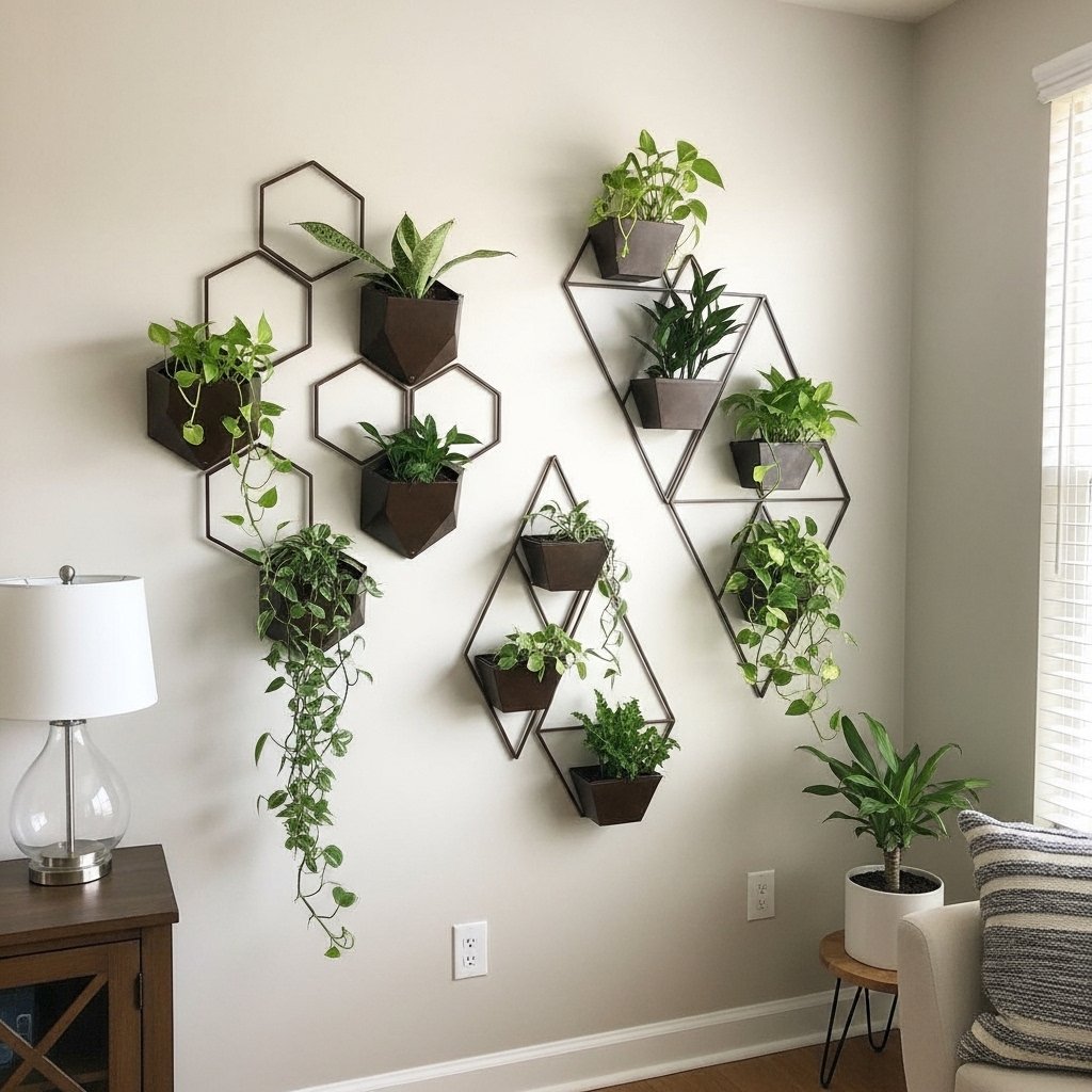 Geometric trellises are perfect for adding a bold and artistic statement to your home. Designs like hexagons, triangles, or abstract shapes turn your plant display into wall art. These trellises are often made from metal or wood and can be customized to fit your space. Climbing plants naturally follow the shapes, enhancing the visual effect. This idea is great for those who want a modern and creative indoor garden.