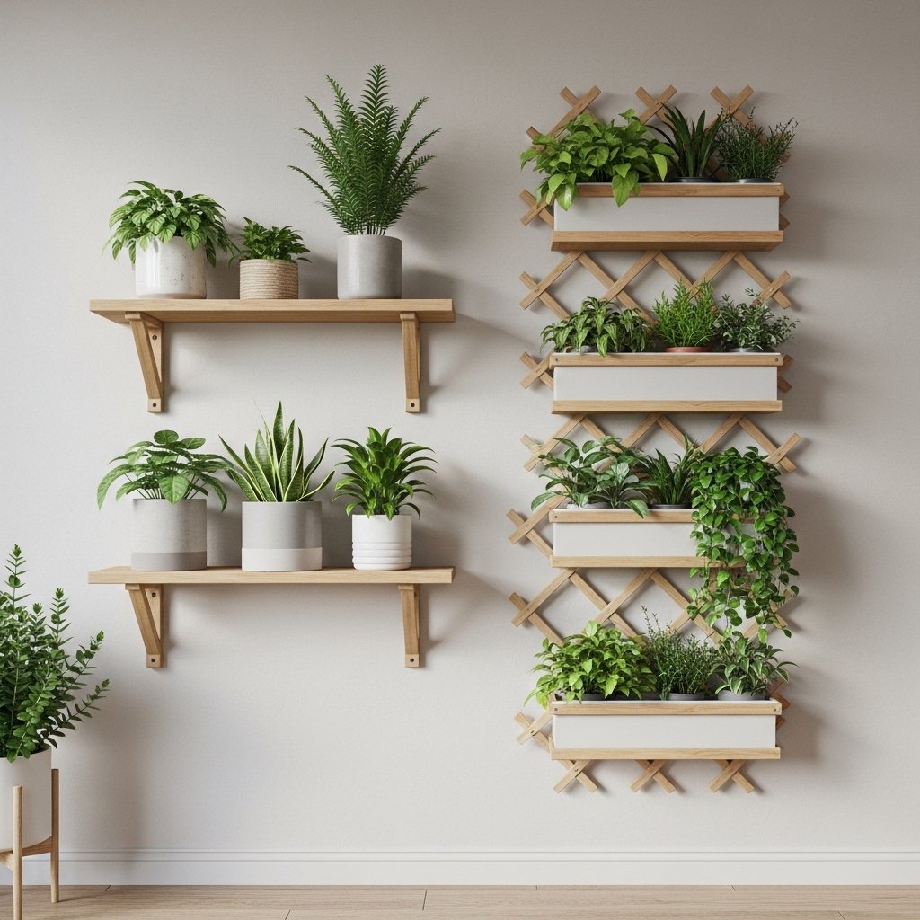 Combining floating shelves with a trellis creates a multi-functional plant display. The shelves can hold pots while the trellis supports climbing vines. This setup adds depth and dimension to your wall. It’s perfect for showcasing different plant varieties in one area. This idea is both practical and visually appealing, making it a popular choice for modern homes.