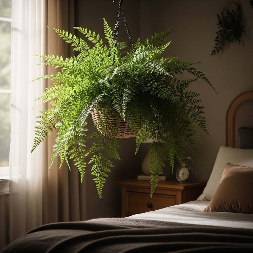 Ferns, such as Boston or Maidenhair varieties, thrive in shaded or low-light bedrooms with higher humidity. Their feathery, delicate foliage adds texture and softness to bedroom décor. While they require slightly more care than some other low-light plants, their lush appearance rewards consistent attention. Ferns also help improve air quality and can make any bedroom feel like a tranquil retreat. They are perfect for bedside tables, hanging baskets, or small plant stands.