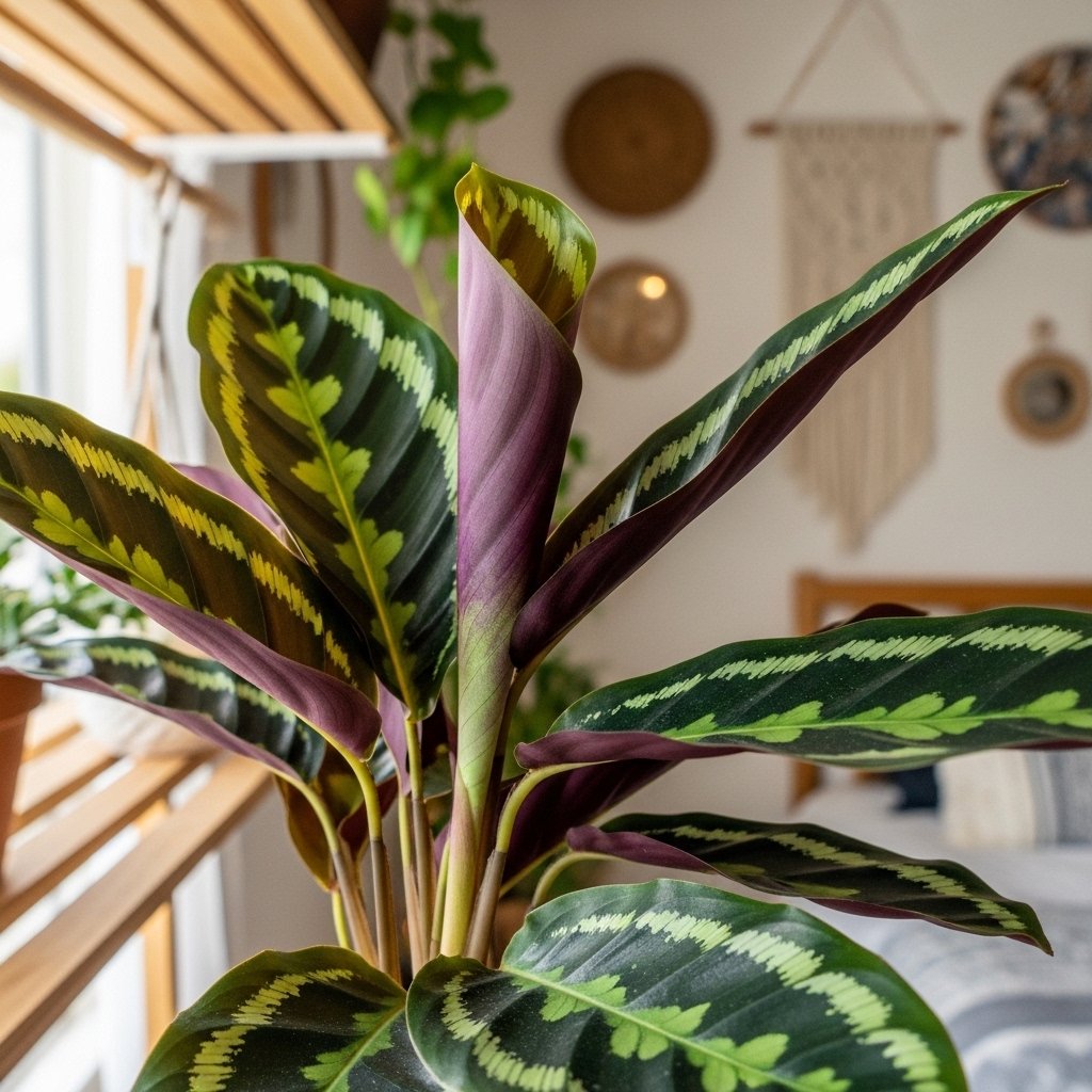 Calathea plants are known for their striking leaf patterns and vibrant colors, making them ideal for low-light indoor spaces. They prefer indirect light and consistent moisture to thrive, so bedrooms with moderate humidity work well. Calatheas open and close their leaves with the light, creating a dynamic and lively presence in your room. These plants add both style and serenity, complementing any modern, bohemian, or natural bedroom design. With proper care, a Calathea becomes a captivating centerpiece in low-light spaces.