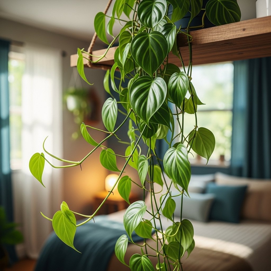 Heartleaf philodendrons are trailing plants with deep green, heart-shaped leaves that flourish in low light. They are forgiving and adapt well to indoor environments, requiring little maintenance. These vines can be placed on shelves or hung in baskets to add vertical interest and a lush, jungle-like feel to your bedroom. Heartleaf philodendrons also help clean the air, contributing to a healthier indoor environment. Their graceful, cascading growth makes them one of the most charming low-light indoor plants.