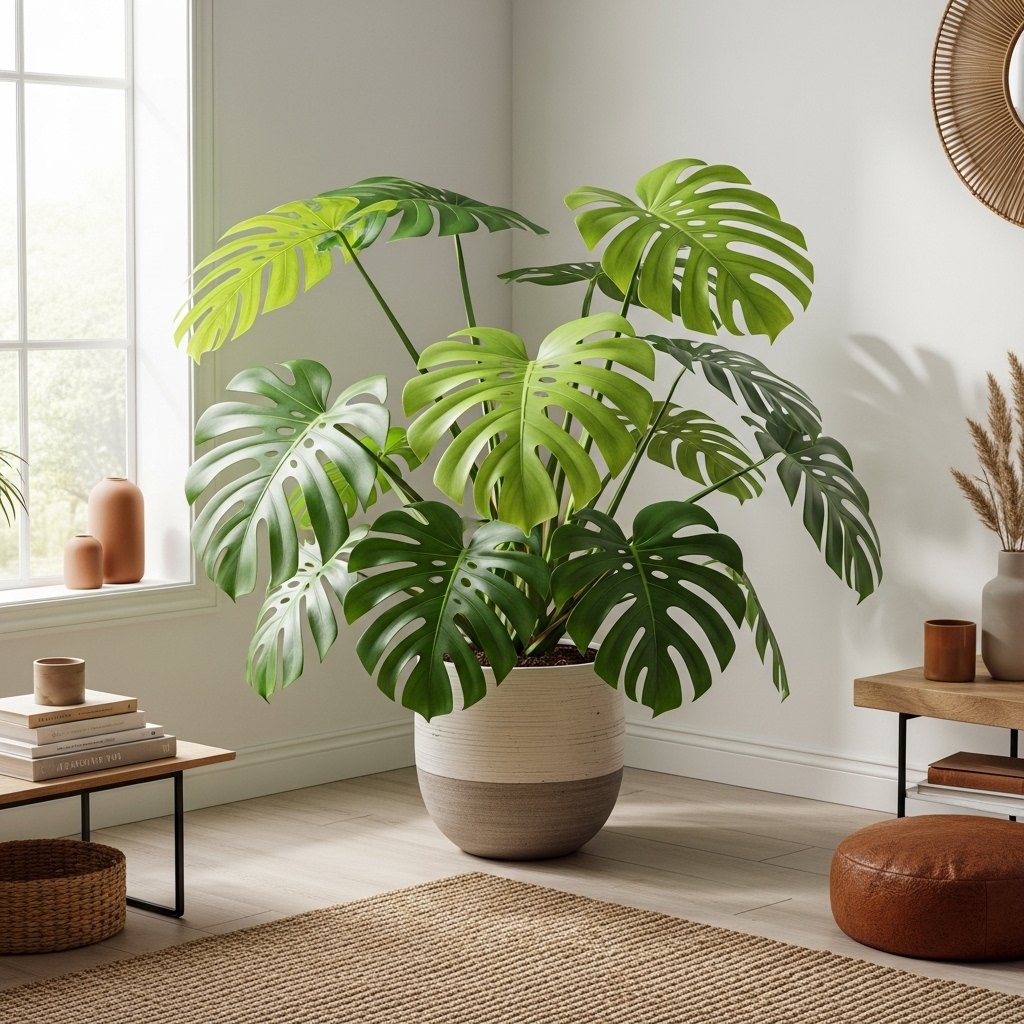 Monstera deliciosa, often called the Swiss cheese plant, is famous for its large, split leaves. It is a statement plant that instantly elevates the look of any room. Monstera thrives in bright, indirect light and requires moderate watering. Its bold foliage makes it perfect for living rooms or corners that need a focal point. This plant is ideal for those looking to create a trendy, tropical indoor aesthetic.