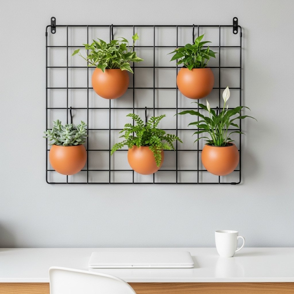 A grid panel plant wall is a modern and customizable way to display indoor plants. Metal grid panels can be mounted on the wall, and small pots or planters can be attached using hooks. This setup allows you to easily change the arrangement whenever you like. It works great in home offices, bedrooms, or creative spaces. The structured design gives a clean and organized look.