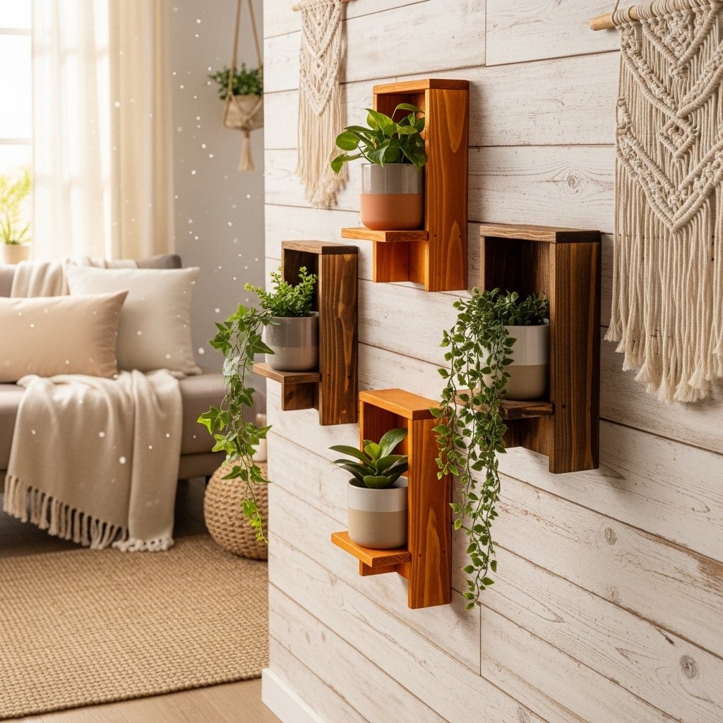 Wooden wall plant holders bring a warm and natural feel to indoor spaces. These holders can be handcrafted or store-bought, and they blend well with rustic or boho interiors. Small potted plants placed in wooden frames create a cozy, earthy vibe. This style works beautifully in living rooms and entryways. It adds both texture and charm to your walls.