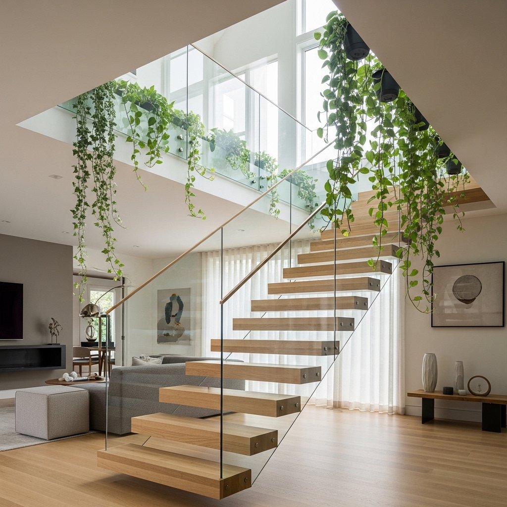 A floating wooden staircase paired with hanging plants creates a stunning modern natural look. The open design of floating stairs allows greenery to flow freely around the structure. You can use trailing plants like pothos or ivy for a cascading effect. Hanging planters from the ceiling or railing enhances the vertical beauty of the space. This setup feels light, airy, and visually striking.