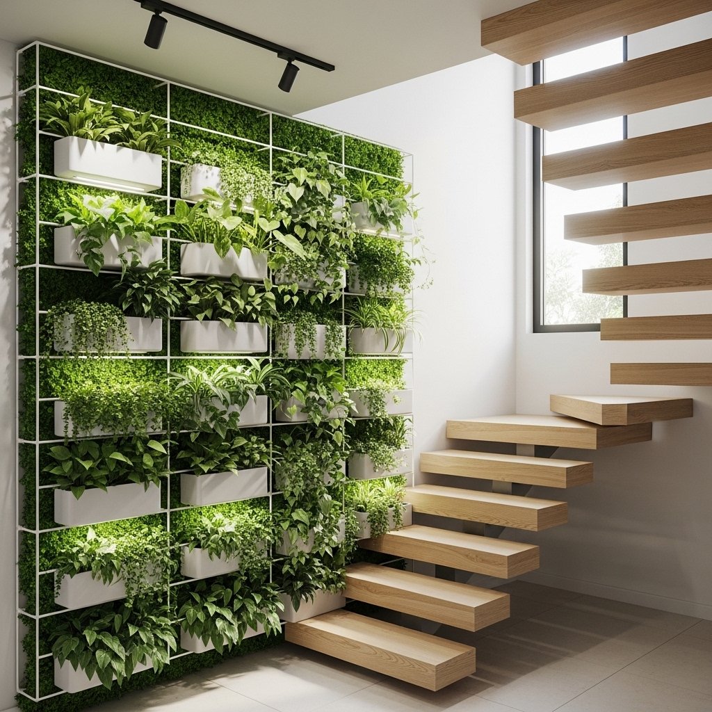 A vertical garden next to a wooden staircase is a space-saving and visually impressive idea. Install wall-mounted planters filled with different types of plants. The wooden stairs act as a grounding element against the lush green wall. This combination creates a fresh and vibrant indoor environment. It is ideal for modern apartments and homes.