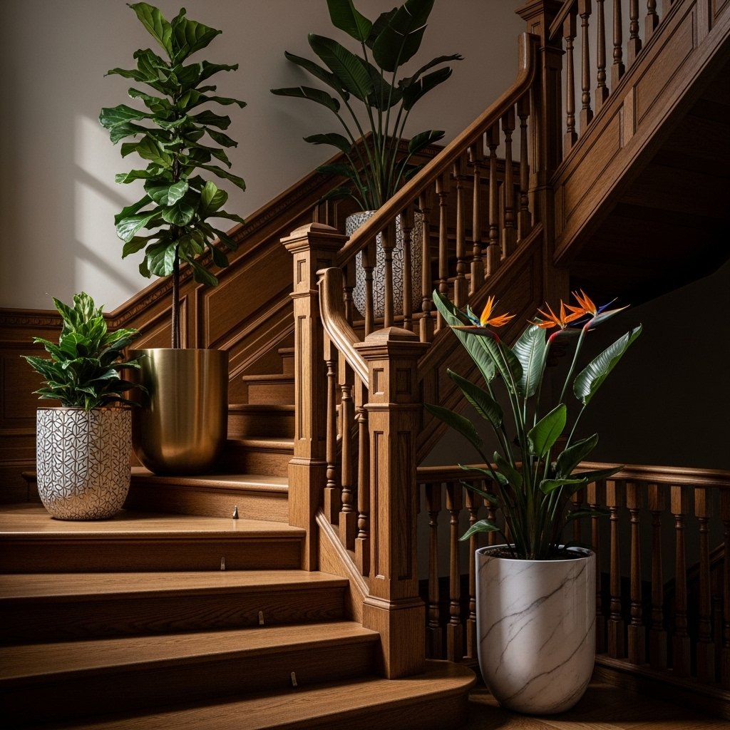 For a high-end interior look, use a polished wooden staircase with carefully selected statement plants. Large decorative plants like palms or birds of paradise can be placed strategically. Pair them with elegant pots in gold, black, or marble finishes. This creates a luxurious and sophisticated atmosphere. The balance of wood and greenery enhances the premium feel of the space.