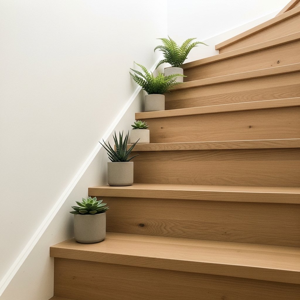 3. Minimalist Wooden Staircase with Small Potted Plants