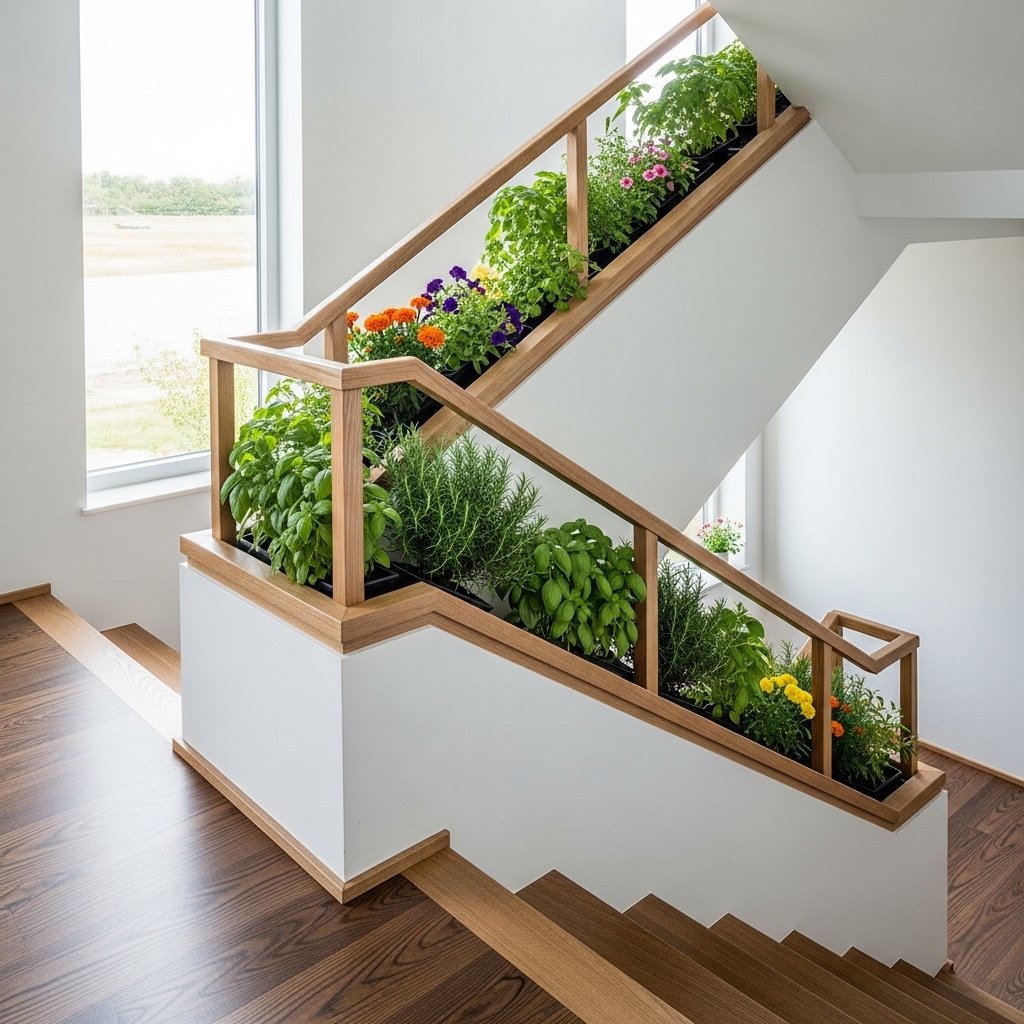 Installing planter boxes along the staircase railing is a creative way to integrate greenery. You can grow herbs, flowers, or decorative plants depending on your preference. Wooden or metal planter boxes blend well with the staircase structure. This design adds life to the stairs without taking up floor space. It also creates a continuous green line throughout the staircase.