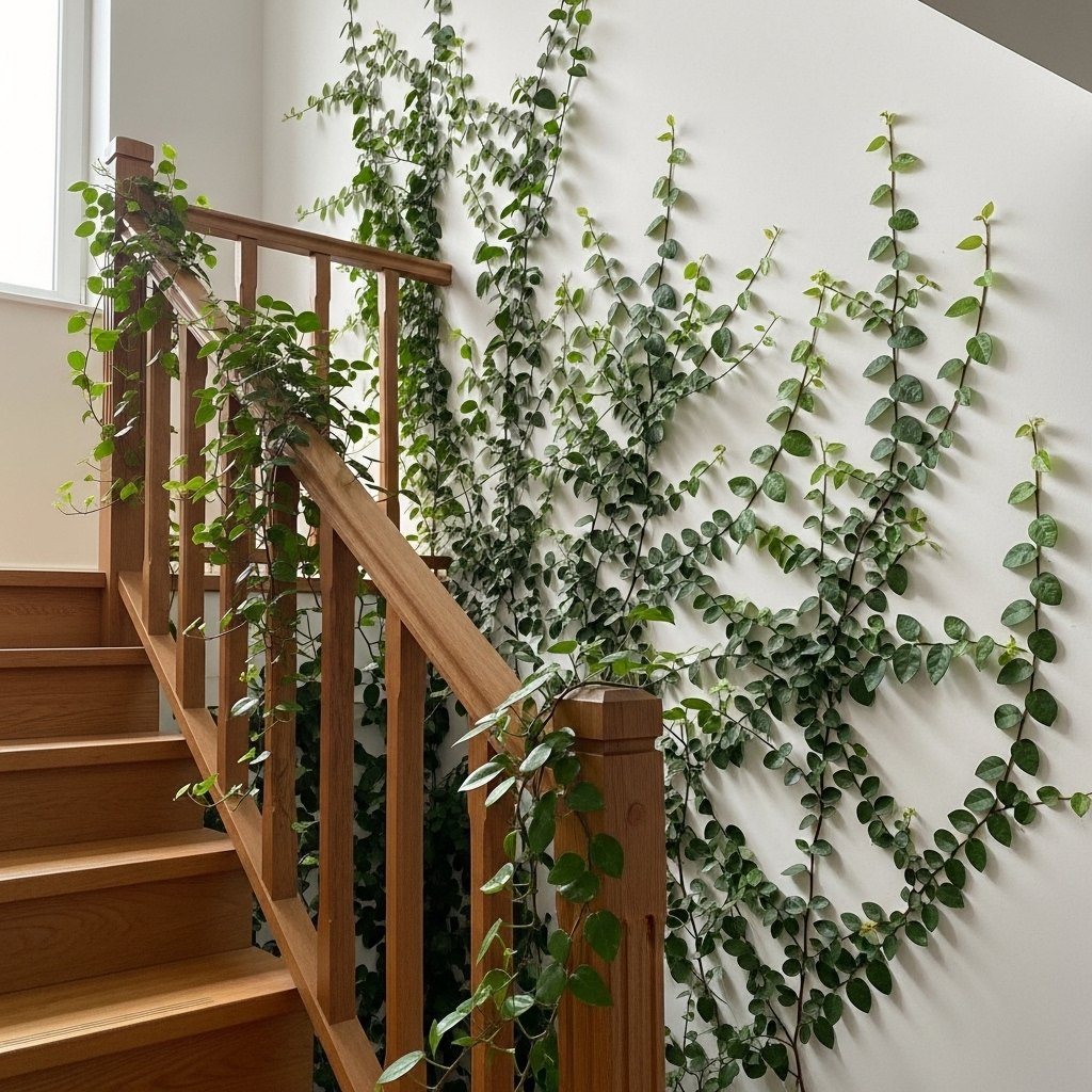 A staircase wall covered with climbing plants creates a dramatic natural effect. Plants like ivy or money plant can be guided to grow upward along the wall. The wooden staircase contrasts beautifully with the green wall. This setup gives the illusion of a living, breathing space. It is ideal for creating a fresh and organic atmosphere indoors.