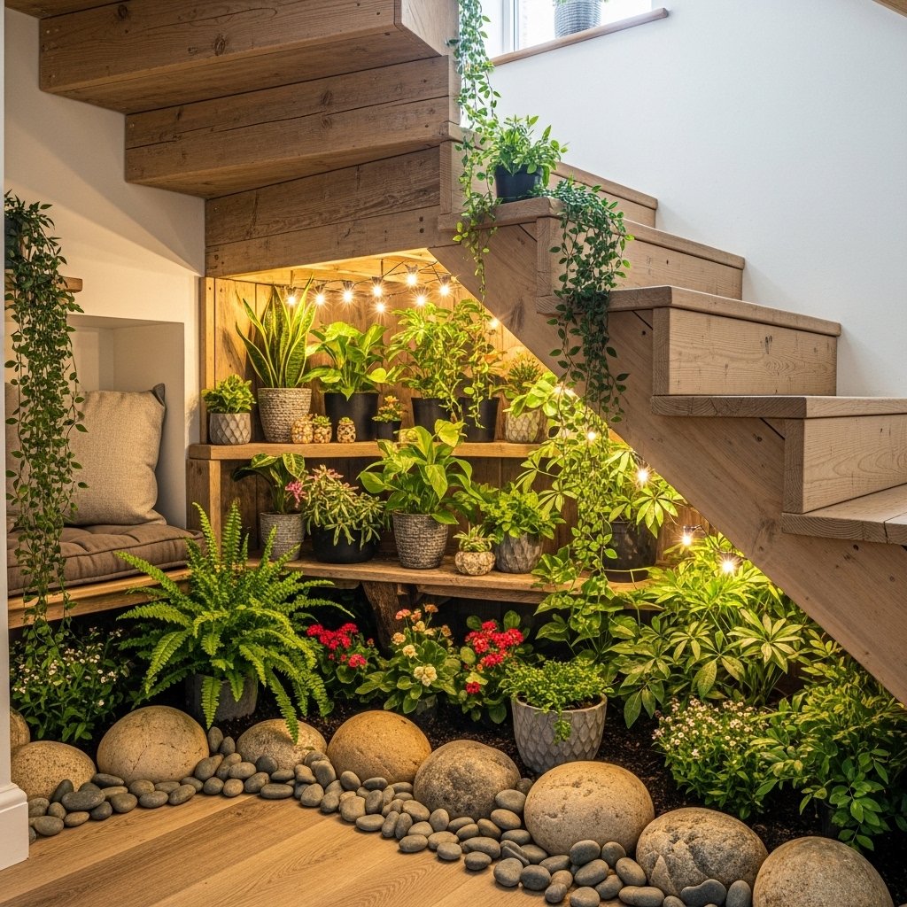 The space under a wooden staircase can be transformed into a mini indoor garden. Add layered plants, decorative stones, and small lighting for a cozy effect. Wooden steps above enhance the natural theme and create harmony. This design makes use of every inch of space creatively. It is both functional and visually appealing.