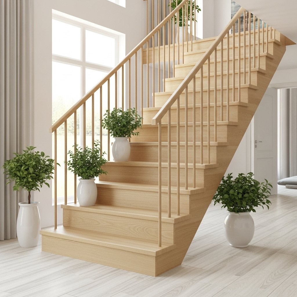 A Scandinavian-style wooden staircase focuses on simplicity and natural light. Adding small green plants along the stairs or nearby shelves enhances the soft aesthetic. Choose light wood tones and simple white pots for consistency. The combination creates a calm and airy environment. This design is ideal for modern, minimal homes.