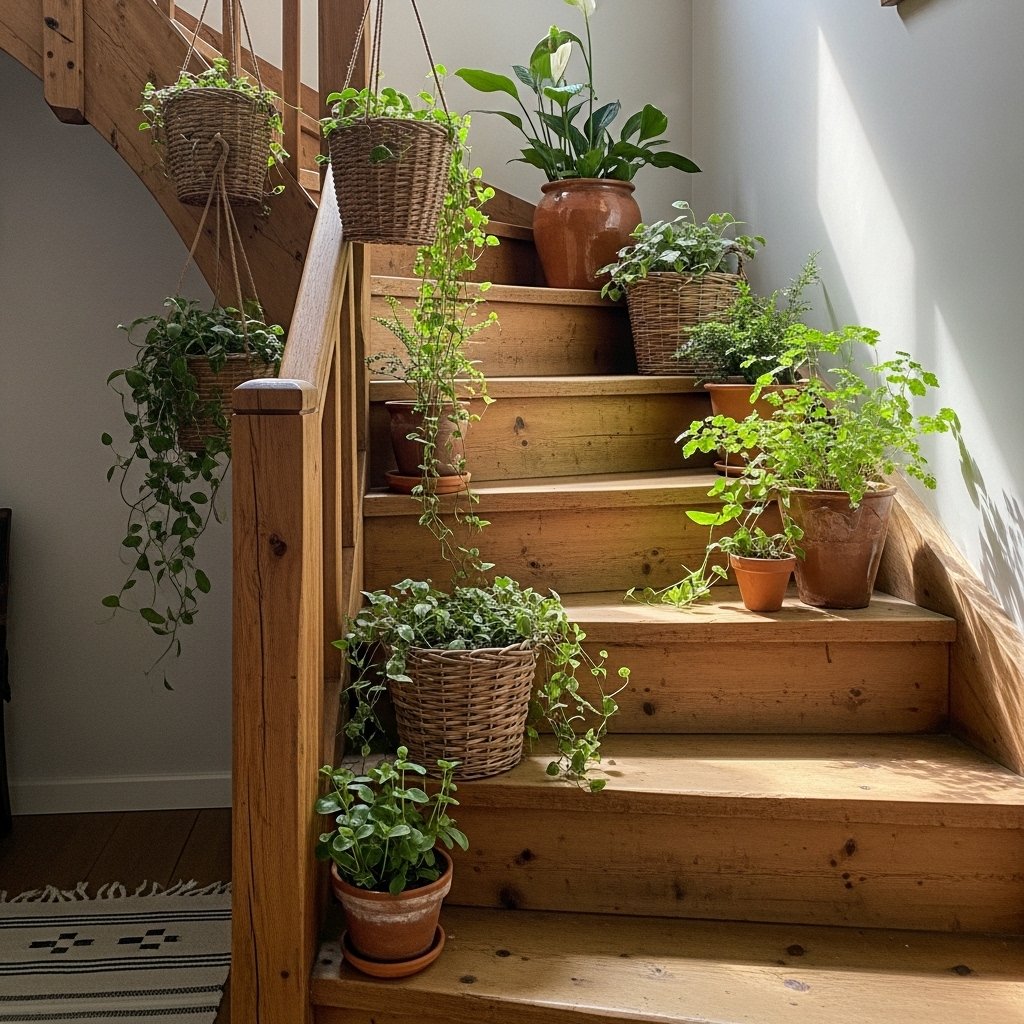 You can decorate a wooden staircase with plants by placing small potted plants on steps, using hanging planters along the railing, or arranging tall plants at the base or top. Combining different sizes and types of plants creates visual interest while keeping the space functional and elegant.