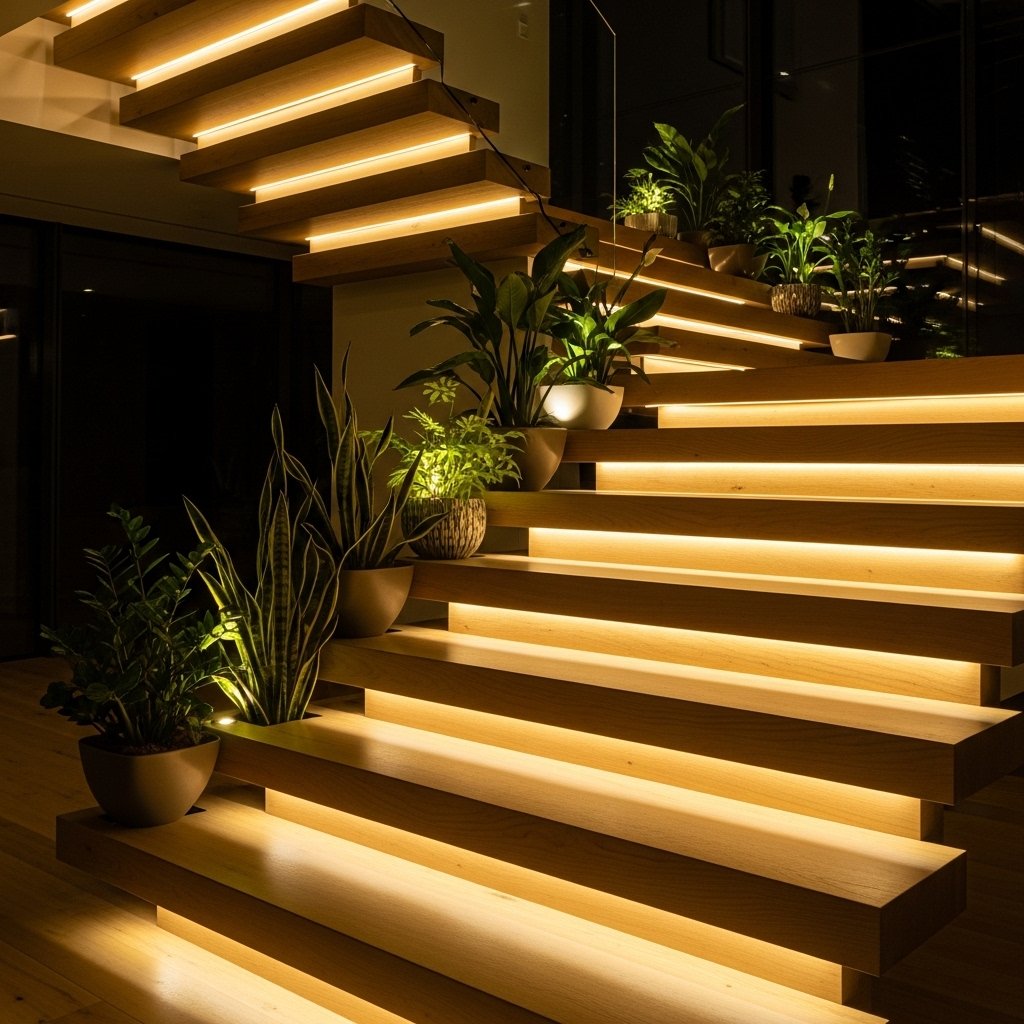 Combining LED lighting with plants along a wooden staircase creates a modern luxury look. Soft warm lights highlight the greenery and wooden texture at night. You can place small plants along illuminated steps or railings. This enhances safety and aesthetics at the same time. The result is a stylish and elegant interior feature.